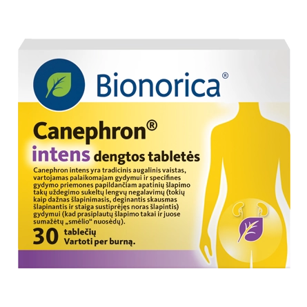 Nereceptinis vaistinis preparatas. Sudėtis. Vienoje dengtoje tabletėje yra 36 mg širdažolių žolės, 36 mg gelsvių šaknų, 36 mg rozmarinų lapų. Terapinės indikacijos. Canephron® intens yra skirtas: palaikomajam gydymui ir specifines gydymo priemones papildančiam apatinių šlapimo takų uždegimo sukeltų lengvų negalavimų (tokių kaip dažnas šlapinimasis, deginantis skausmas šlapinantis ir staiga sustiprėjęs noras šlapintis) gydymui; kad prasiplautų šlapimo takai ir juose sumažėtų „smėlio“ nuosėdų. Tradicinis augalinis vaistas, kurio indikacijos pagrįstos tik ilgalaikiu vartojimu. Dozavimas ir vartojimo būdas. Suaugusiesiems ir paaugliams nuo 12 metų vartoti po 1 dengtą tabletę 3 kartus per parą. Gerkite po vieną Canephron® intens dengtą tabletę ryte, per pietus, vakare. Gausiai vartokite skysčių, kad palengvintumėte gydymą. Kontraindikacijos. Vartoti negalima: jeigu yra alergija veikliosioms medžiagoms, kitiems skėtinių šeimos augalams (pvz., anyžiui, pankoliui), anetoliui (eterinių aliejų sudedamajai daliai) arba bet kuriai pagalbinei šio vaisto medžiagai; jeigu sergama skrandžio opalige; esant edemai dėl širdies ar inkstų funkcijos sutrikimo ir (arba) jei gydytojas rekomenduoja mažinti skysčių vartojimą. Specialūs įspėjimai. Tęsiantis karščiavimui, pasireiškus apatinės pilvo dalies skausmui, spazmams, pastebėjus šlapime kraujo, atsiradus šlapinimosi sutrikimams ar ūmiam šlapimo susilaikymui, reikia nedelsiant pasitarti su gydytoju. Gydytojui įvertinus nėštumo aplinkybes ir paskyrus Canephron® intens, vaistą vartoti galima. Teksto parengimo data 2021-12-13.