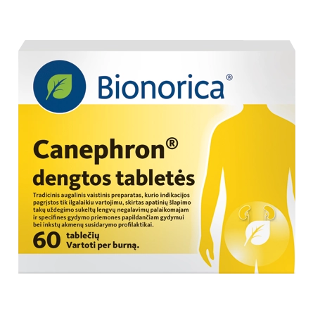 Nereceptinis vaistinis preparatas. Sudėtis. Vienoje dengtoje tabletėje yra 18 mg skėtinių širdažolių žolės, 18 mg vaistinių gelsvių šaknų, 18 mg kvapiųjų rozmarinų lapų. Terapinės indikacijos. Canephron® yra skirtas apatinių šlapimo takų uždegimo sukeltiems lengviems negalavimams gydyti bei inkstų akmenų susidarymo profilaktikai. Tradicinis augalinis vaistinis preparatas, kurio indikacijos pagrįstos ilgalaikiu vartojimu. Dozavimas ir vartojimo būdas. Vienkartinė dozė yra 2 tabletės. Paaugliams nuo 12 metų ir suaugusiesiems reikia gerti vienkartinę dozę ryte, per pietus ir vakare. Tabletes išgerti nesukramtytas, užgeriant trupučiu skysčio. Kontraindikacijos. Vartoti negalima: jeigu skrandyje yra aktyvių pepsinių opų; yra padidėjęs jautrumas širdažolių žolei, gelsvių šaknims, rozmarinų lapams, kitiems skėtinių šeimos augalams (pvz., anyžius, krapai) arba bet kuriai pagalbinei medžiagai; jeigu sutrikusi inkstų funkcija; sergant uždegimine inkstų liga; esant edemai dėl sutrikusios širdies funkcijos. Specialūs įspėjimai. Pastebėjus kraujo šlapime, tęsiantis karščiavimui, pasireiškus spazmams, atsiradus šlapinimosi sutrikimų ar ūmiam šlapimo susilaikymui, reikia nedelsiant pasitarti su gydytoju. Teksto parengimo data 2021-01-11.